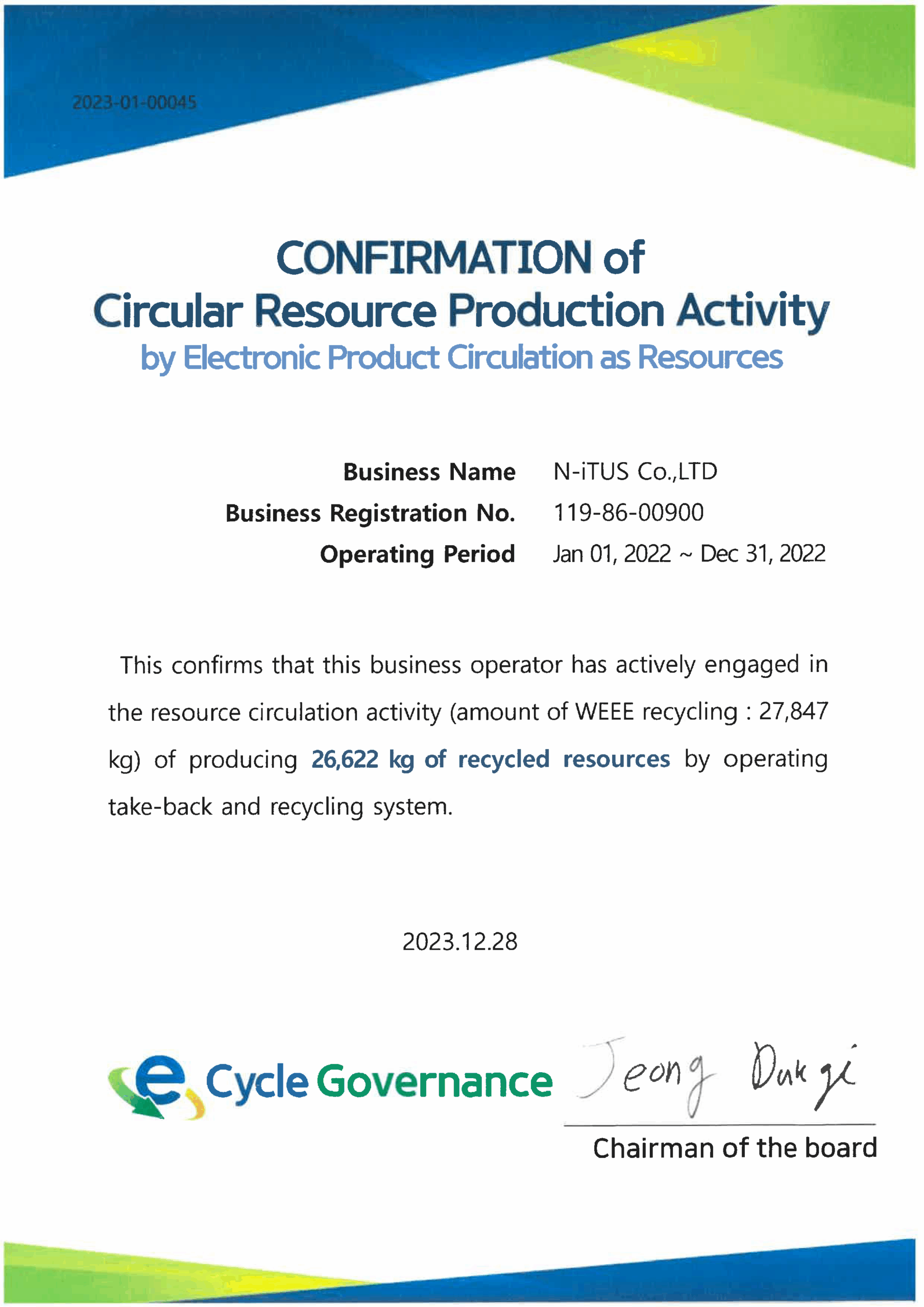 – Registrar for the Waste Management Act, Fire Prevention, Act on Installation and Maintenance of Firefighting Facilities and Safety Management, Act on Resource Conservation and Recycling Promotion, Occupational Safety and Health Act, Act on Resource Circulation of Electrical and Electronic Products and Automobiles, and RoHS